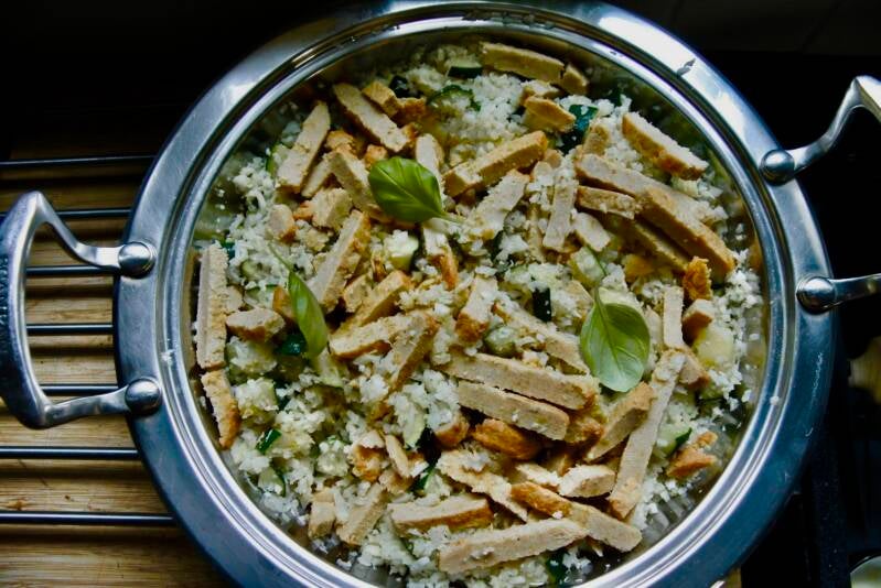 - Doe in een grote pan of tajine een bodem water en doe er de bloemkoolrijst en courgette in. Laat het deksel op de pan en roer af en toe eens goed
